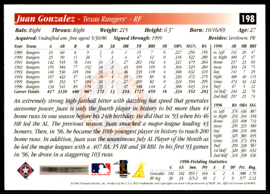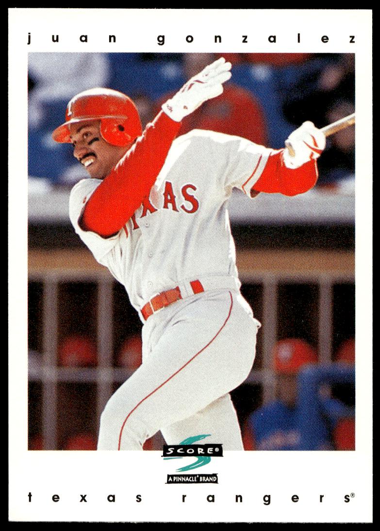 This BaseballΒ card, from 1997 is part of the Pinnacle ScoreΒ card set. Juan Gonzalez is featured and has a card number of 11.