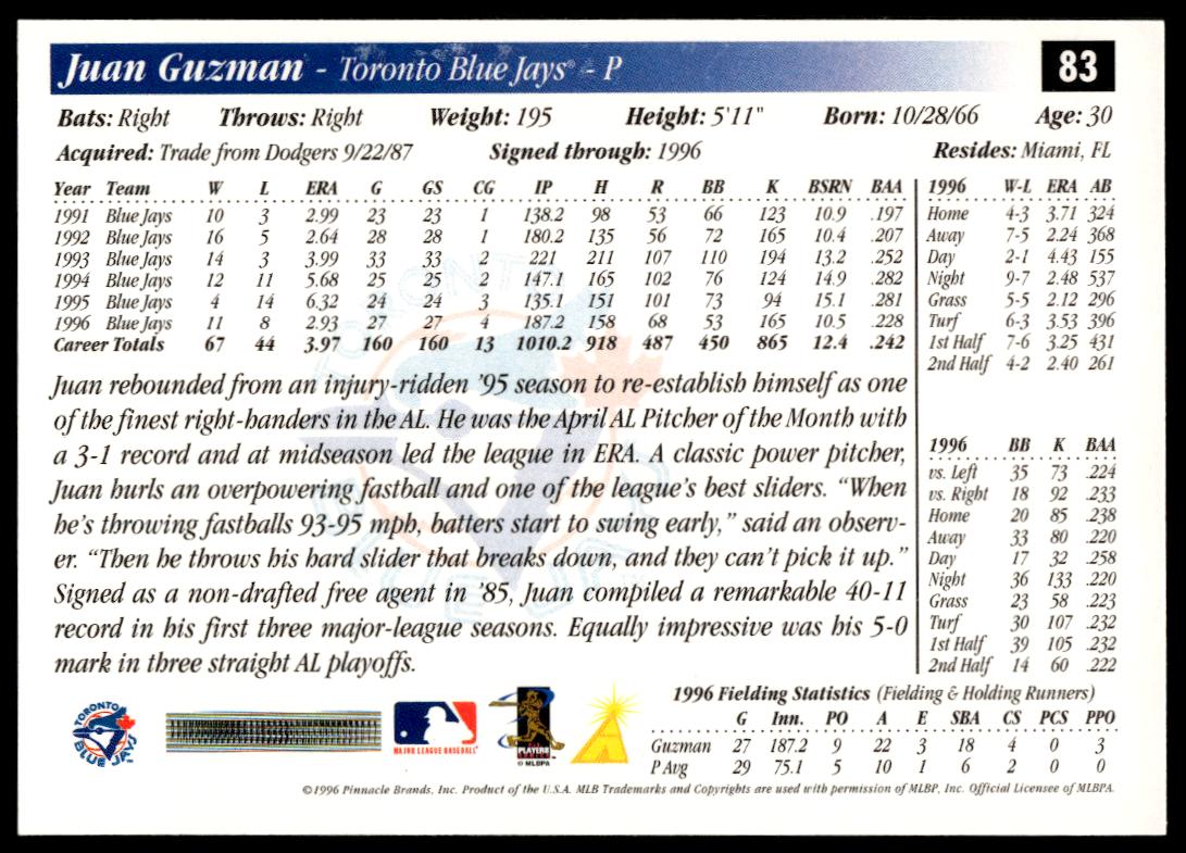 This BaseballΒ card, from 1997 is part of the Pinnacle ScoreΒ card set. Juan Guzman is featured and has a card number of 83.