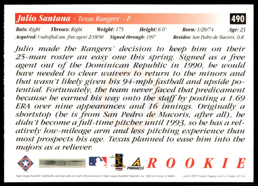This BaseballΒ card, from 1997 is part of the Pinnacle ScoreΒ card set. Julio Santana is featured and has a card number of 490.