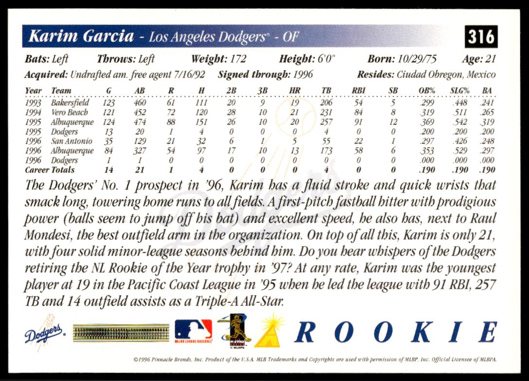 This BaseballΒ card, from 1997 is part of the Pinnacle ScoreΒ card set. Karim Garcia is featured and has a card number of 316.