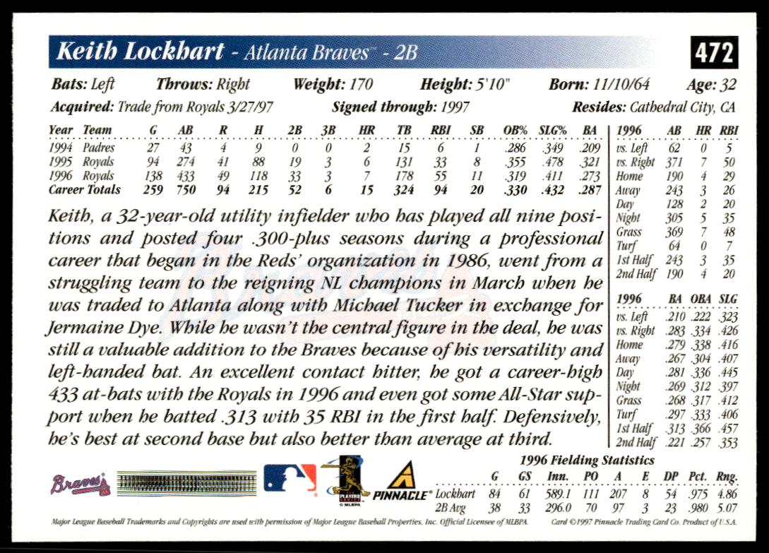 This BaseballΒ card, from 1997 is part of the Pinnacle ScoreΒ card set. Keith Lockhart is featured and has a card number of 472.