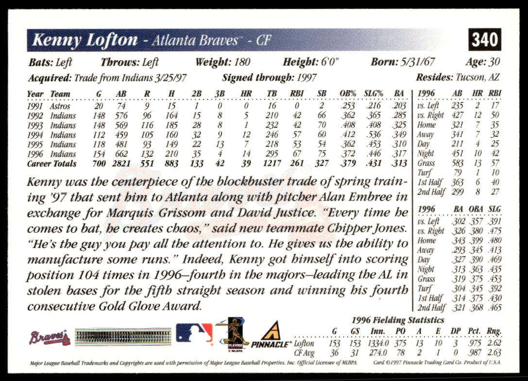 This BaseballΒ card, from 1997 is part of the Pinnacle ScoreΒ card set. Kenny Lofton is featured and has a card number of 340.