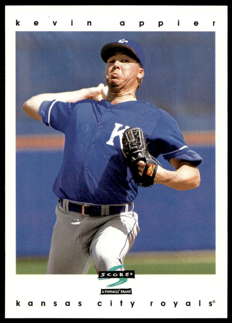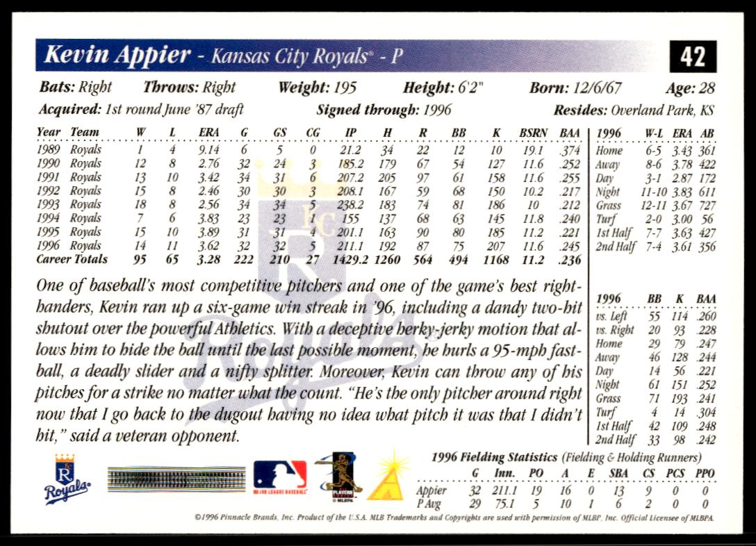 This BaseballΒ card, from 1997 is part of the Pinnacle ScoreΒ card set. Kevin Appier is featured and has a card number of 42.