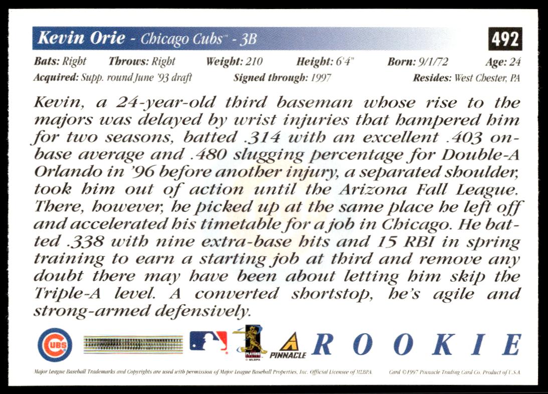 This BaseballΒ card, from 1997 is part of the Pinnacle ScoreΒ card set. Kevin Orie is featured and has a card number of HR492.
