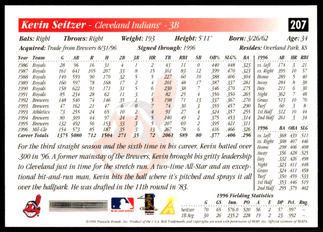This Baseball card, from 1997 is part of the Pinnacle Score card set. Kevin Seitzer is featured and has a card number of 11.