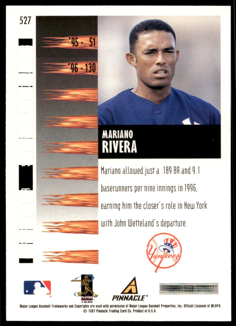 This BaseballΒ card, from 1997 is part of the Pinnacle ScoreΒ card set. Mariano Rivera is featured and has a card number of 527.