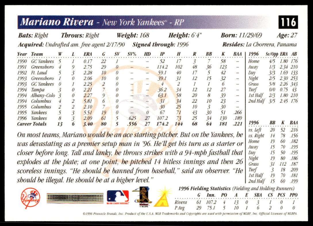 This BaseballΒ card, from 1997 is part of the Pinnacle ScoreΒ card set. Mariano Rivera is featured and has a card number of 7.