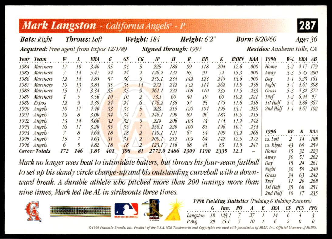This BaseballΒ card, from 1997 is part of the Pinnacle ScoreΒ card set. Mark Langston is featured and has a card number of 287.
