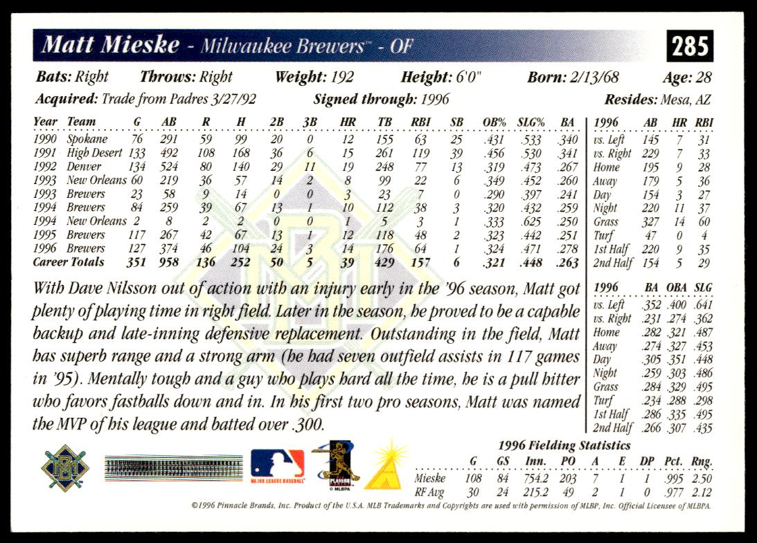 This BaseballΒ card, from 1997 is part of the Pinnacle ScoreΒ card set. Matt Mieske is featured and has a card number of 285.
