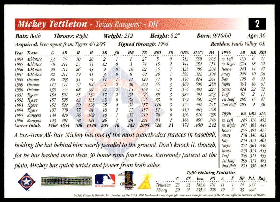 This BaseballΒ card, from 1997 is part of the Pinnacle ScoreΒ card set. Mickey Tettleton is featured and has a card number of 1.