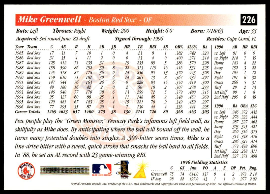This BaseballΒ card, from 1997 is part of the Pinnacle ScoreΒ card set. Mike Greenwell is featured and has a card number of 12.