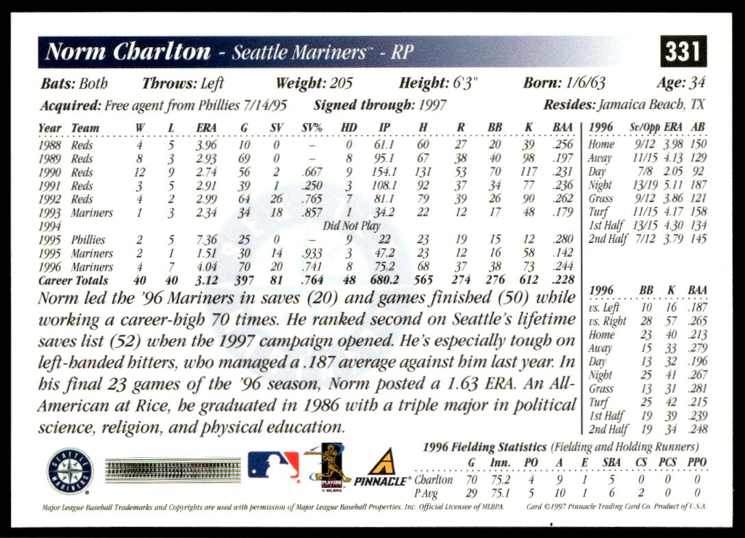 This BaseballΒ card, from 1997 is part of the Pinnacle ScoreΒ card set. Norm Charlton is featured and has a card number of 331.