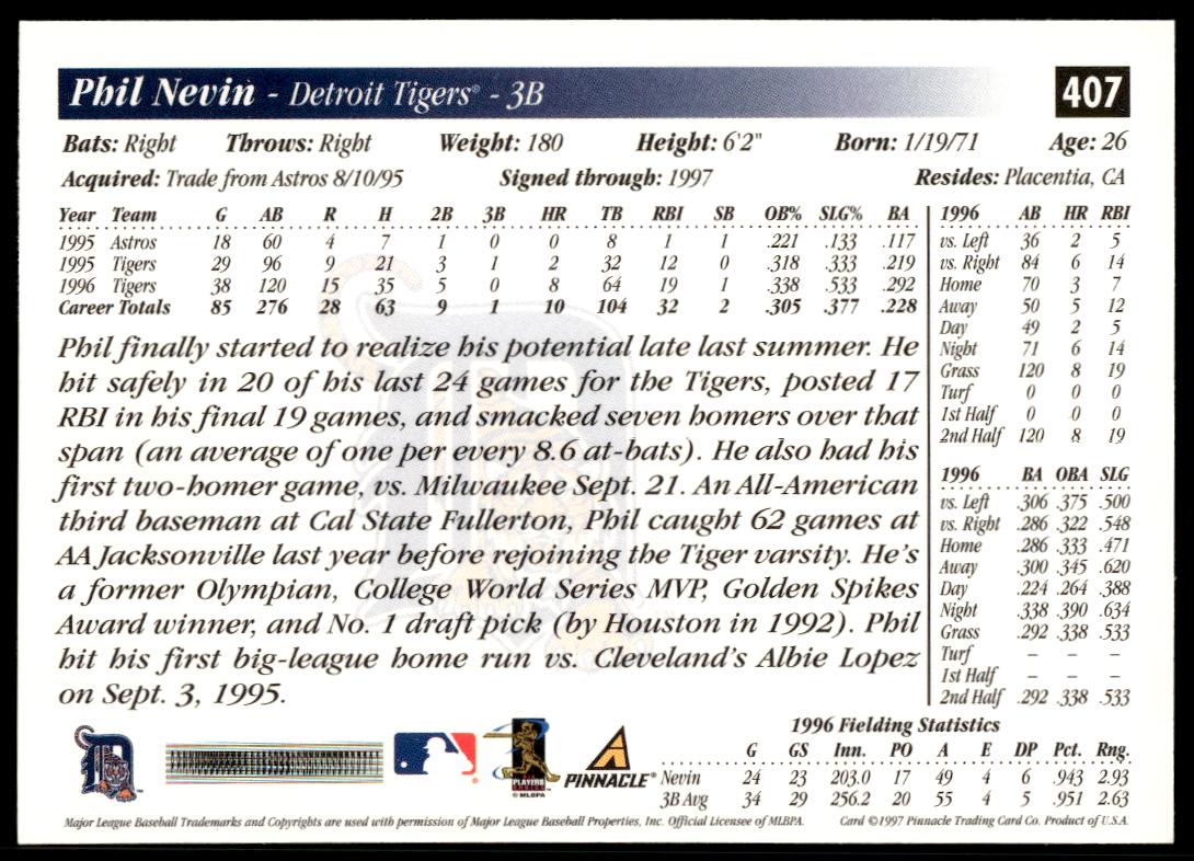 This BaseballΒ card, from 1997 is part of the Pinnacle ScoreΒ card set. Phil Nevin is featured and has a card number of 407.