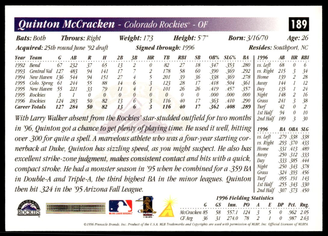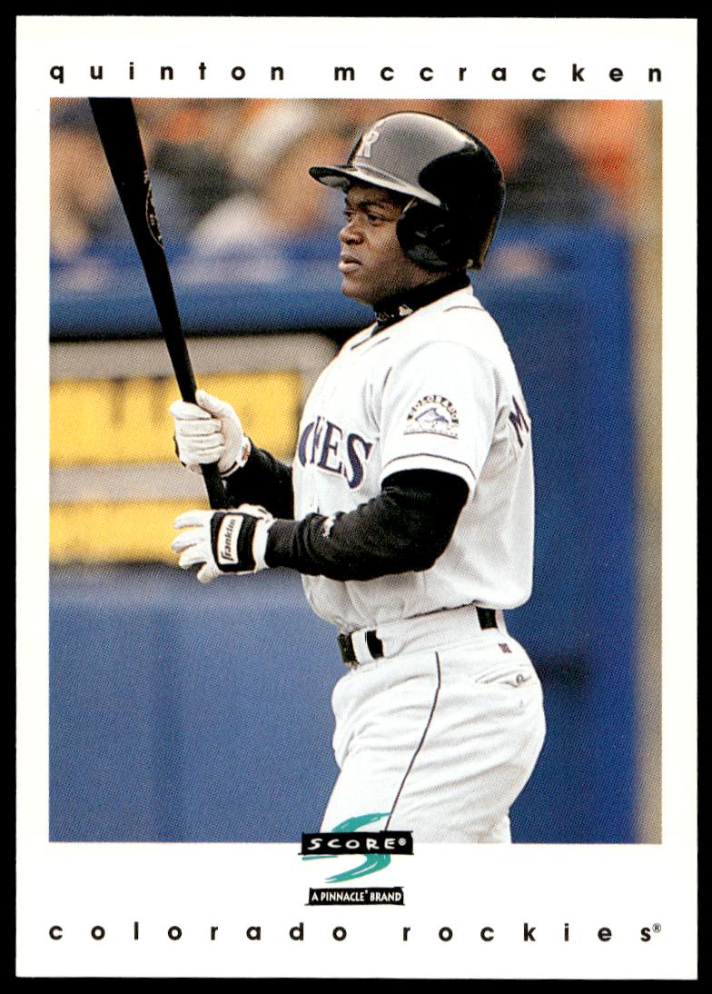 This BaseballΒ card, from 1997 is part of the Pinnacle ScoreΒ card set. Quinton McCracken is featured and has a card number of 10.