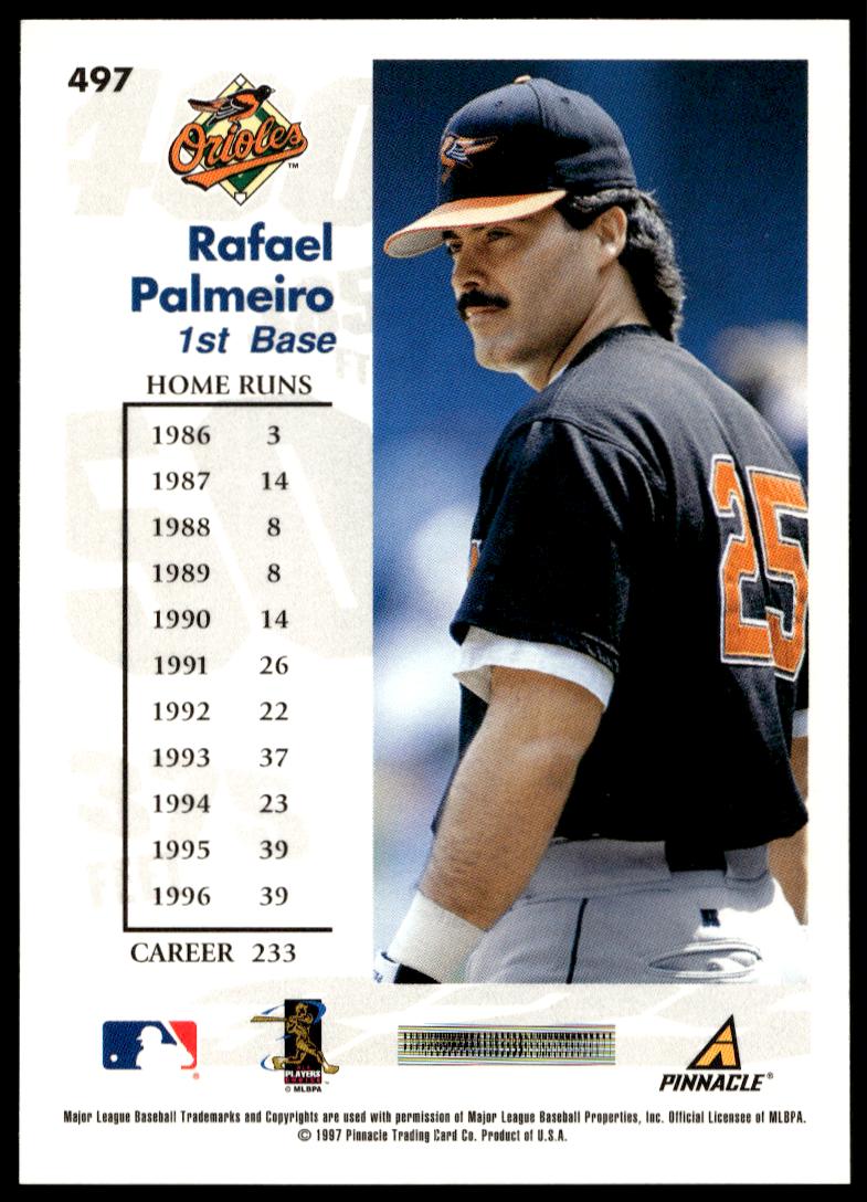 This Baseball card, from 1997 is part of the Pinnacle Score card set. Rafael Palmeiro is featured and has a card number of 497.