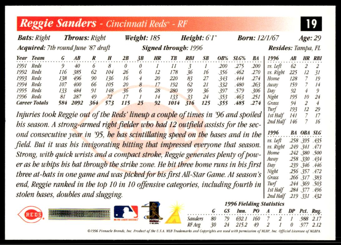 This BaseballΒ card, from 1997 is part of the Pinnacle ScoreΒ card set. Reggie Sanders is featured and has a card number of 19.
