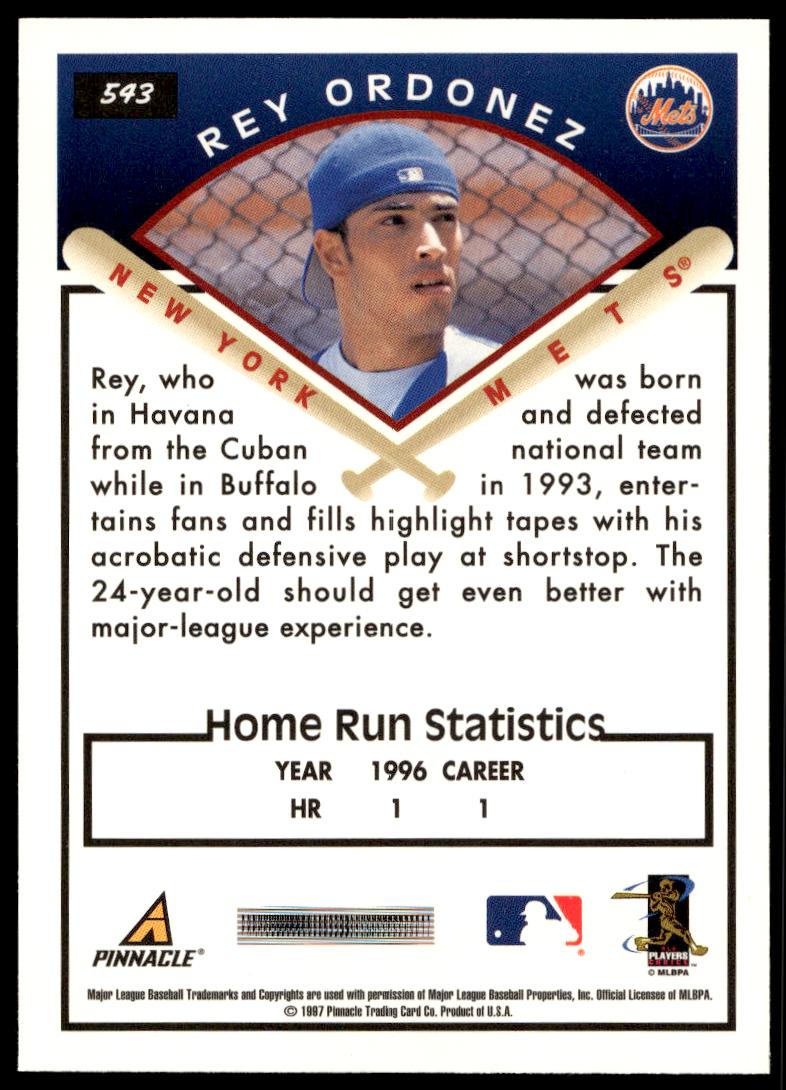 This BaseballΒ card, from 1997 is part of the Pinnacle ScoreΒ card set. Rey Ordonez is featured and has a card number of 543.