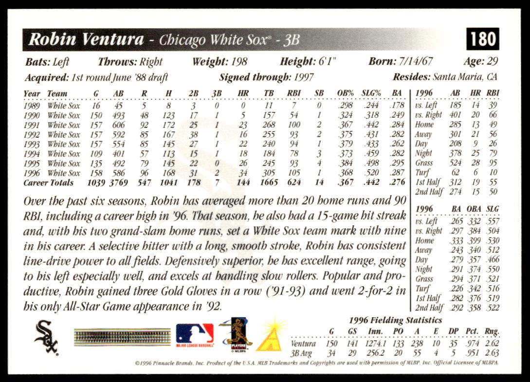 This BaseballΒ card, from 1997 is part of the Pinnacle ScoreΒ card set. Robin Ventura is featured and has a card number of 8.
