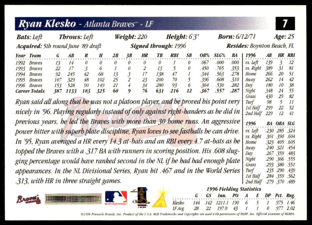 This BaseballΒ card, from 1997 is part of the Pinnacle ScoreΒ card set. Ryan Klesko is featured and has a card number of 1.