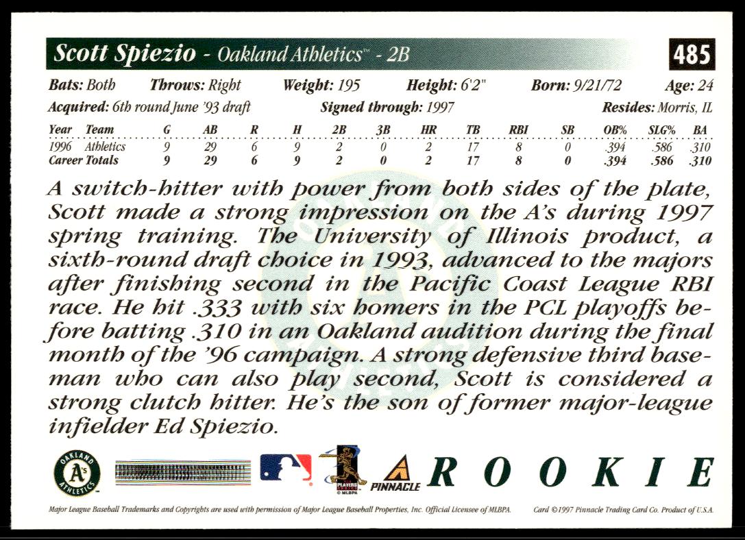 This BaseballΒ card, from 1997 is part of the Pinnacle ScoreΒ card set. Scott Spiezio is featured and has a card number of 485.