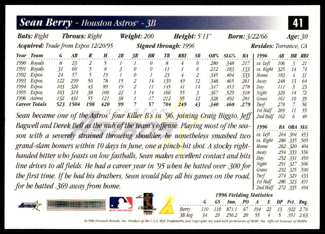 This BaseballΒ card, from 1997 is part of the Pinnacle ScoreΒ card set. Sean Berry is featured and has a card number of 41.
