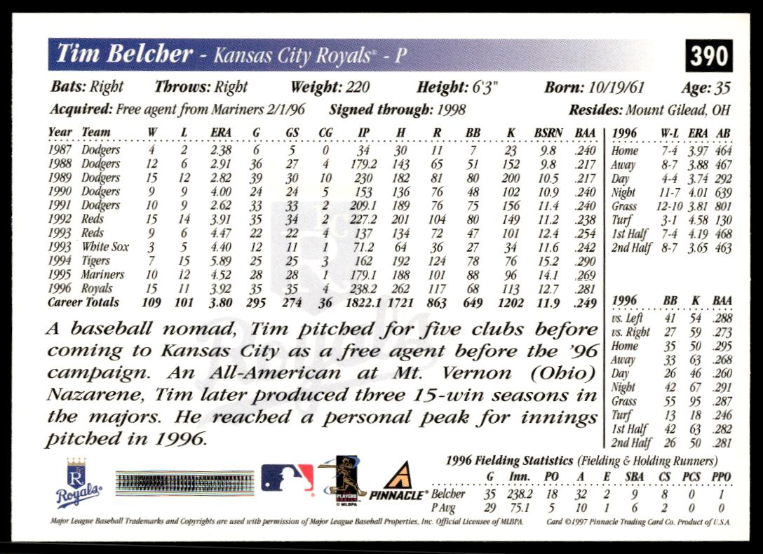 This BaseballΒ card, from 1997 is part of the Pinnacle ScoreΒ card set. Tim Belcher is featured and has a card number of 390.