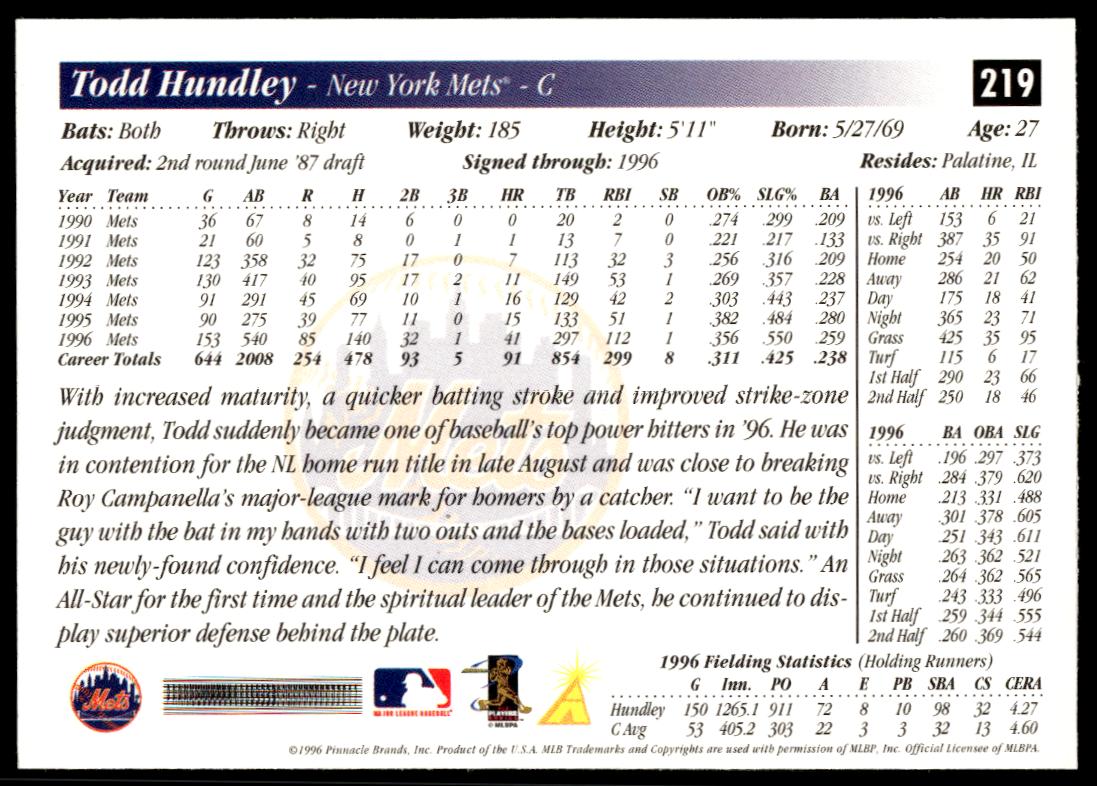 This Baseball card, from 1997 is part of the Pinnacle Score card set. Todd Hundley is featured and has a card number of 219.