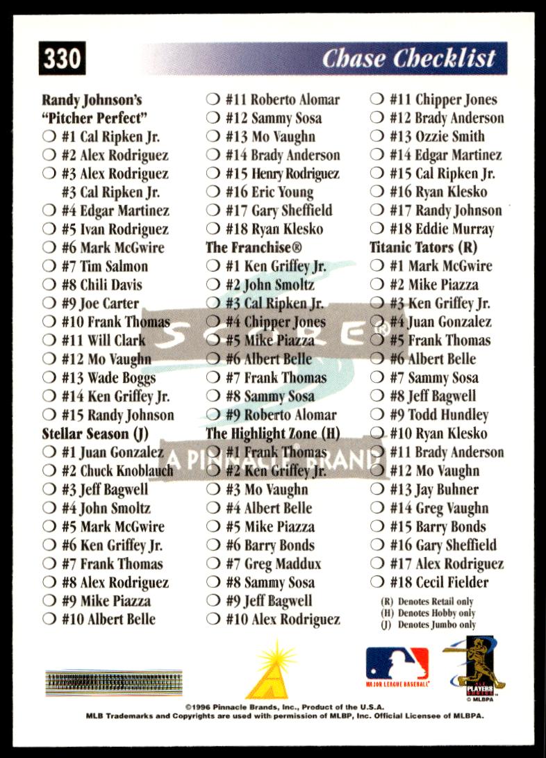 This Baseball card, from 1997 is part of the Pinnacle Score card set. Todd Hundley is featured and has a card number of 330.
