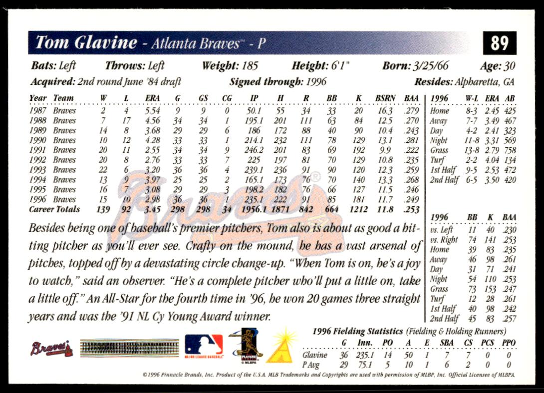 This BaseballΒ card, from 1997 is part of the Pinnacle ScoreΒ card set. Tom Glavine is featured and has a card number of 4.