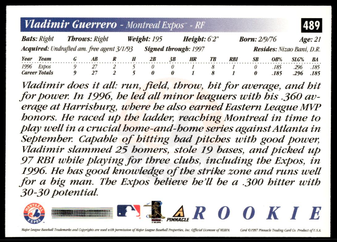 This BaseballΒ card, from 1997 is part of the Pinnacle ScoreΒ card set. Vladimir Guerrero is featured and has a card number of 489.