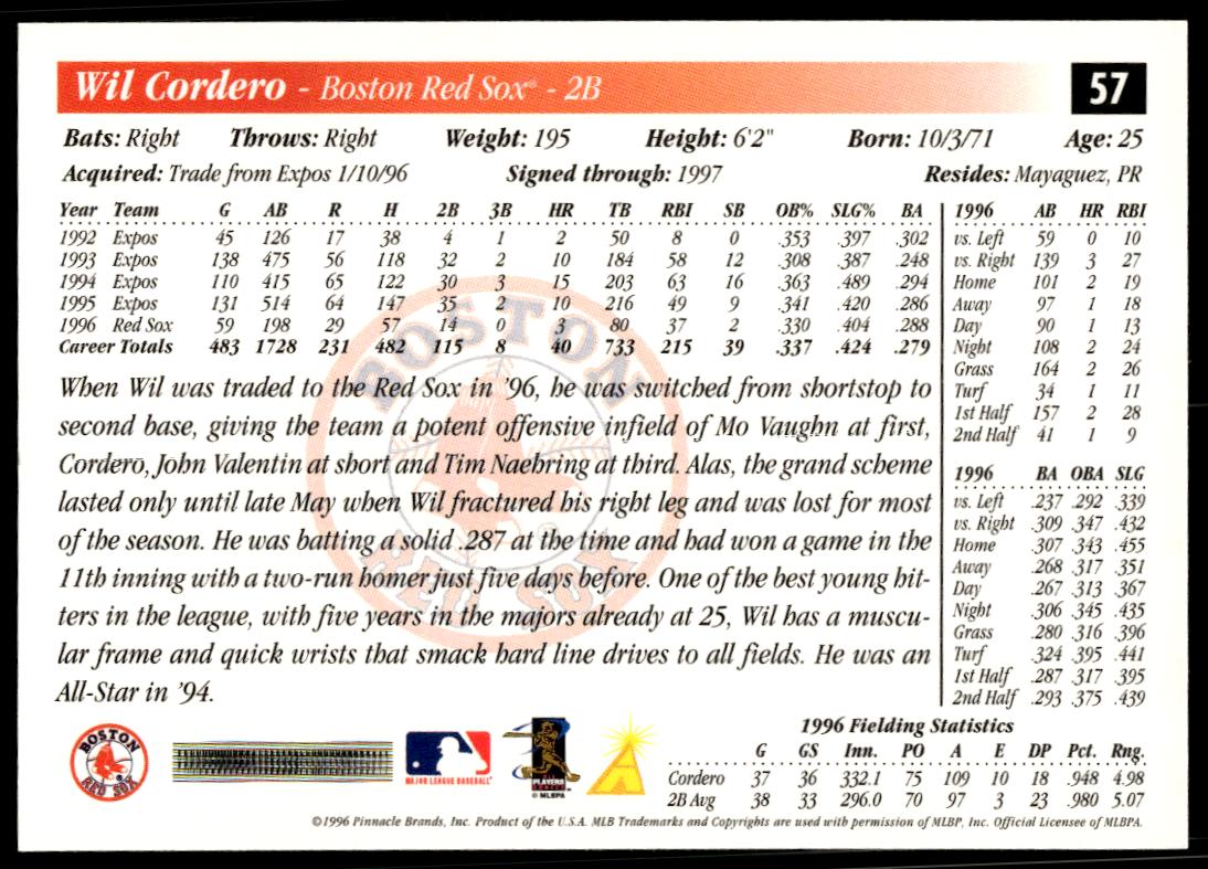 This BaseballΒ card, from 1997 is part of the Pinnacle ScoreΒ card set. Wil Cordero is featured and has a card number of 1.