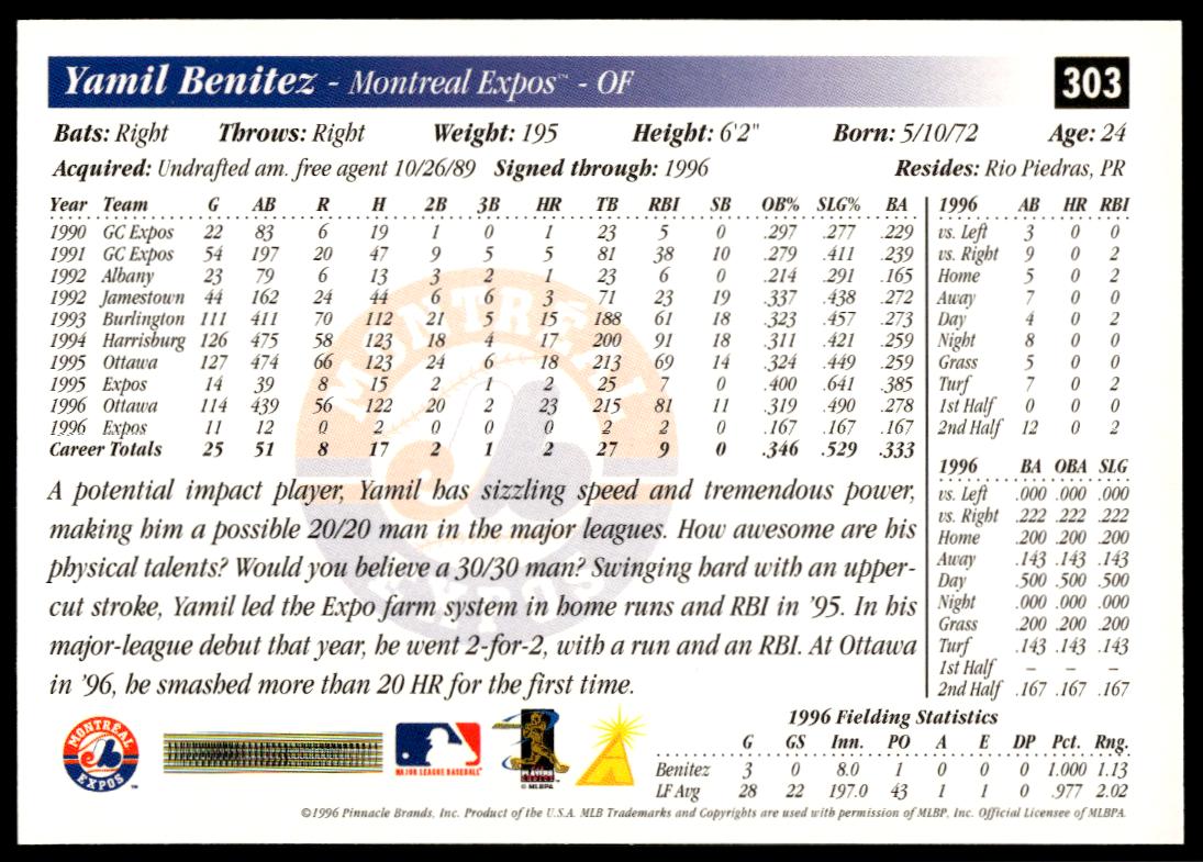 This BaseballΒ card, from 1997 is part of the Pinnacle ScoreΒ card set. Yamil Benitez is featured and has a card number of 303.
