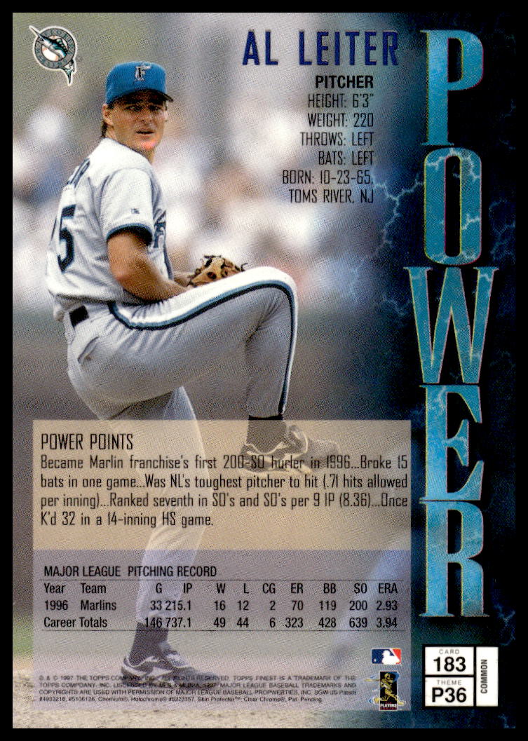 This Baseball card, from 1997 is part of the Topps Finest card set. Al Leiter is featured and has a card number of 183.