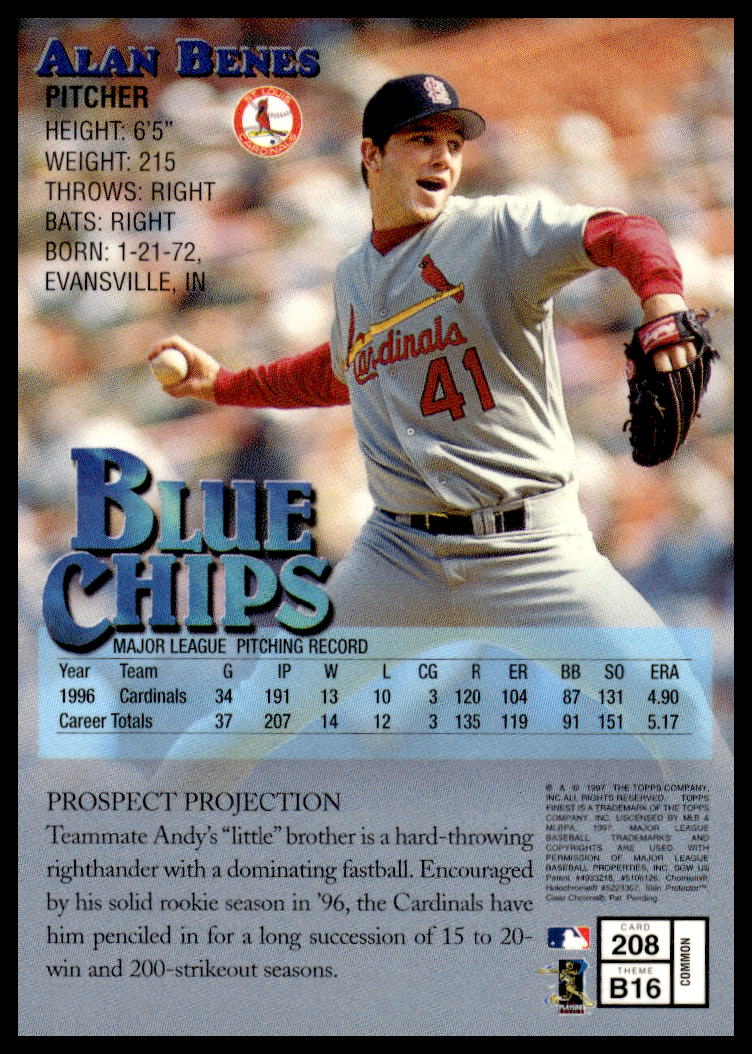 This Baseball card, from 1997 is part of the Topps Finest card set. Alan Benes is featured and has a card number of 208.