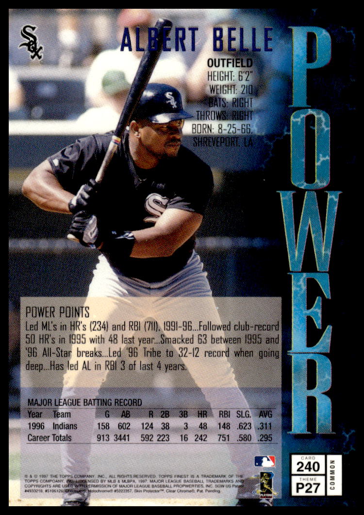 This Baseball card, from 1997 is part of the Topps Finest card set. Albert Belle is featured and has a card number of 240.