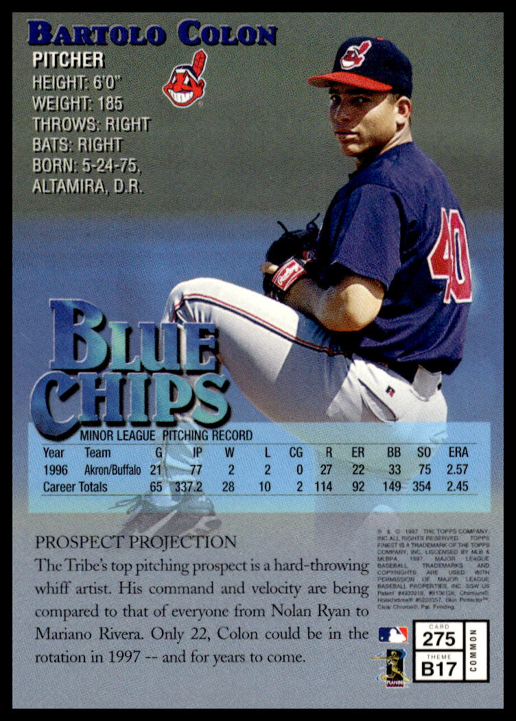 This BaseballΒ card, from 1997 is part of the Topps FinestΒ card set. Bartolo Colon is featured and has a card number of 275.