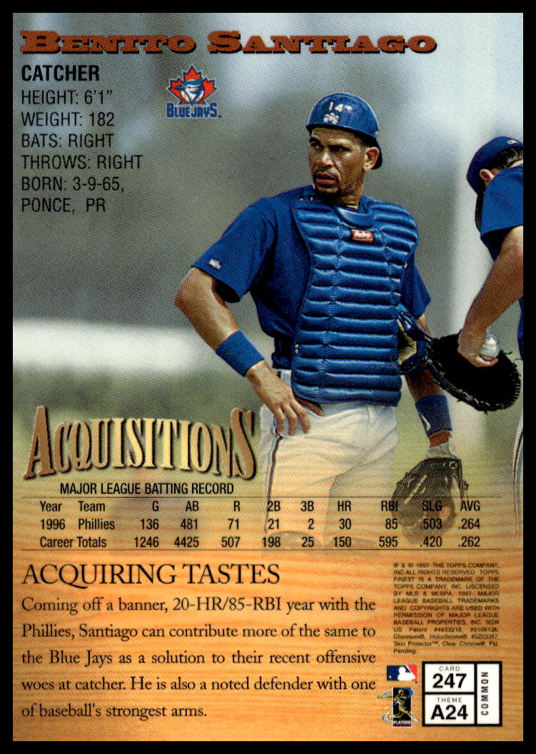 This Baseball card, from 1997 is part of the Topps Finest card set. Benito Santiago is featured and has a card number of 247.
