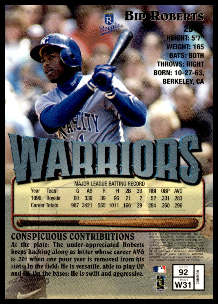 This Baseball card, from 1997 is part of the Topps Finest card set. Bip Roberts is featured and has a card number of 92.