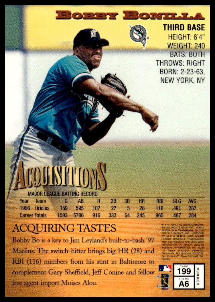 This Baseball card, from 1997 is part of the Topps Finest card set. Bobby Bonilla is featured and has a card number of 199.
