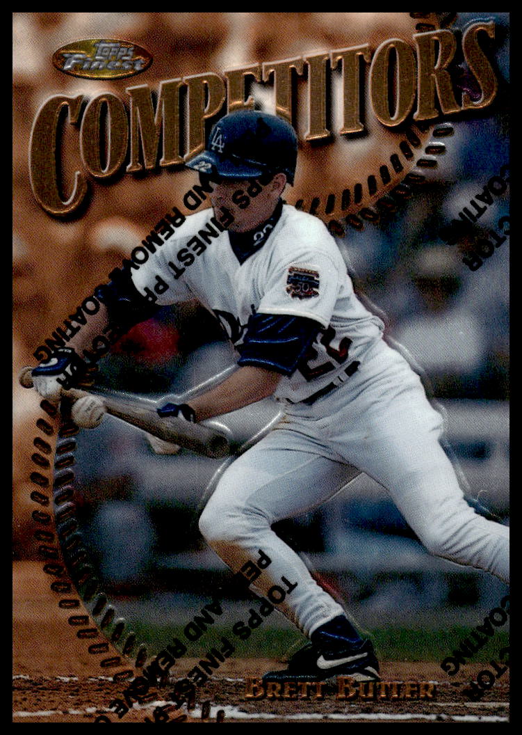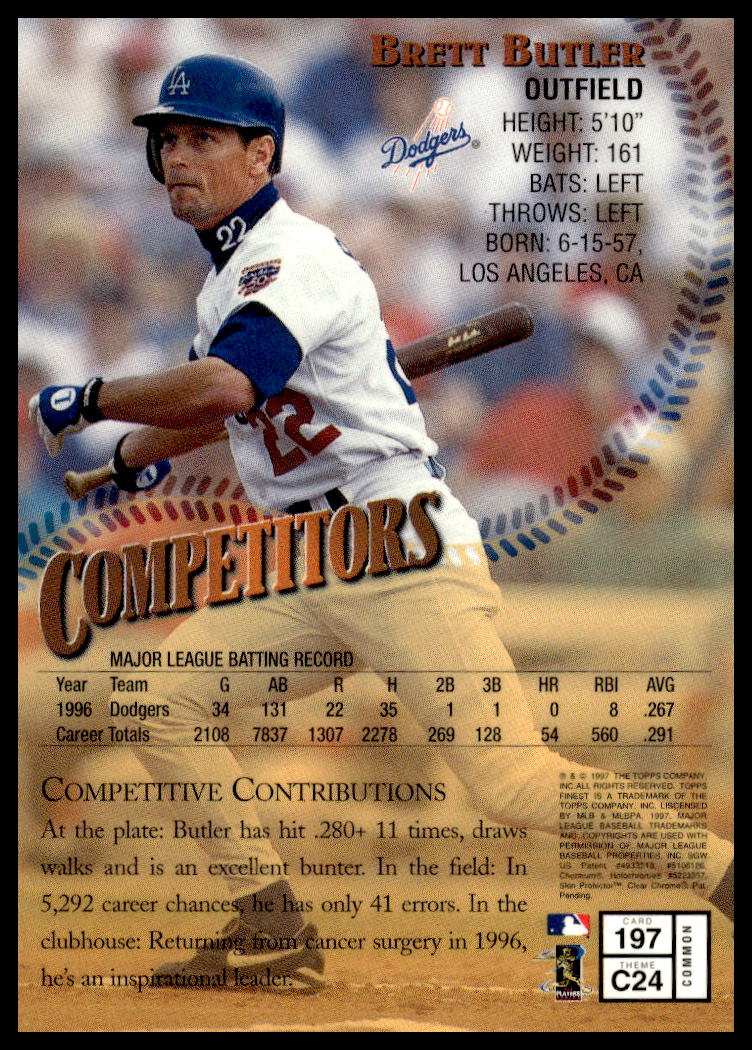 This BaseballΒ card, from 1997 is part of the Topps FinestΒ card set. Brett Butler is featured and has a card number of 197.