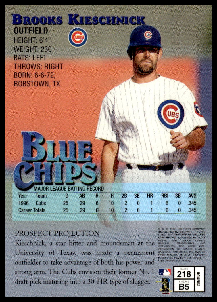 This Baseball card, from 1997 is part of the Topps Finest card set. Brooks Kieschnick is featured and has a card number of 218.