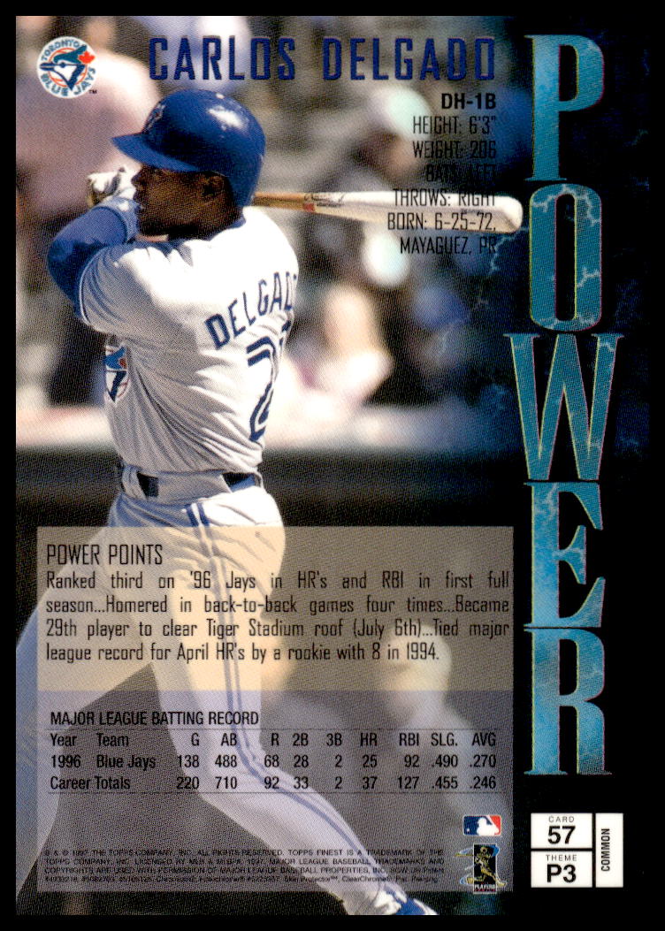 This Baseball card, from 1997 is part of the Topps Finest card set. Carlos Delgado is featured and has a card number of 57.