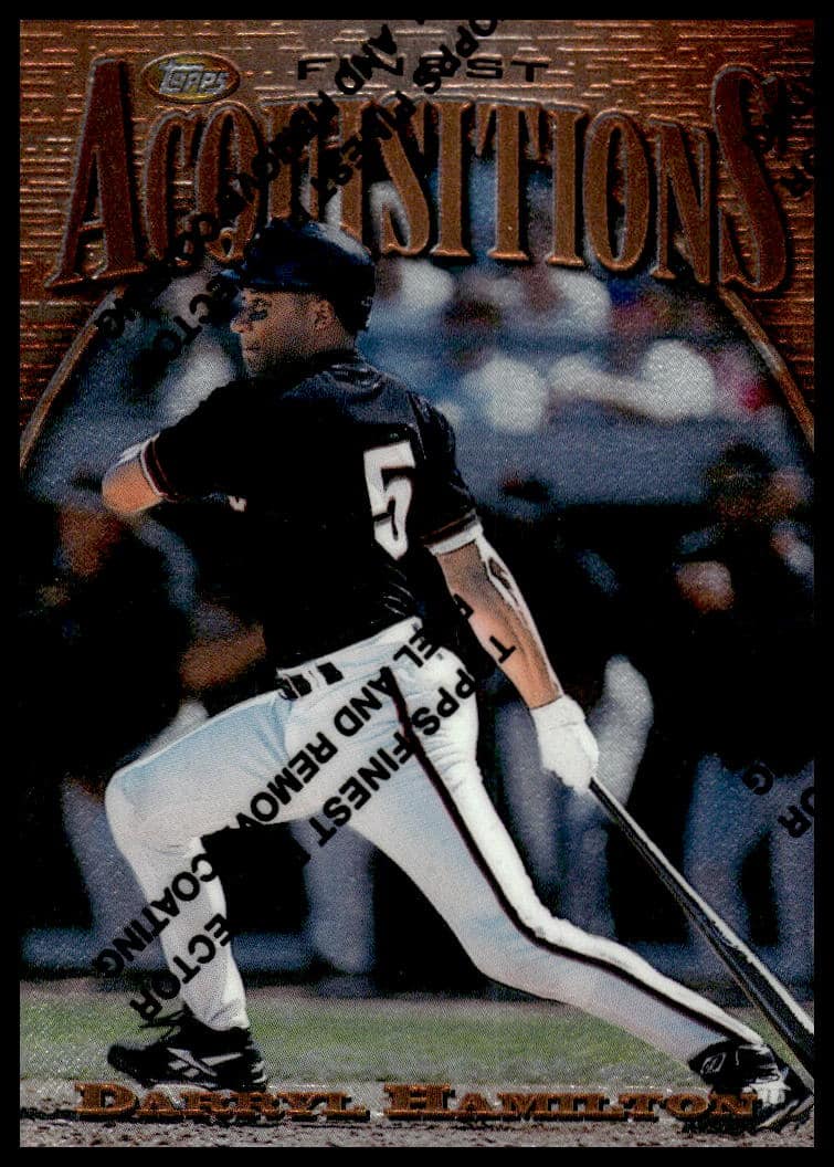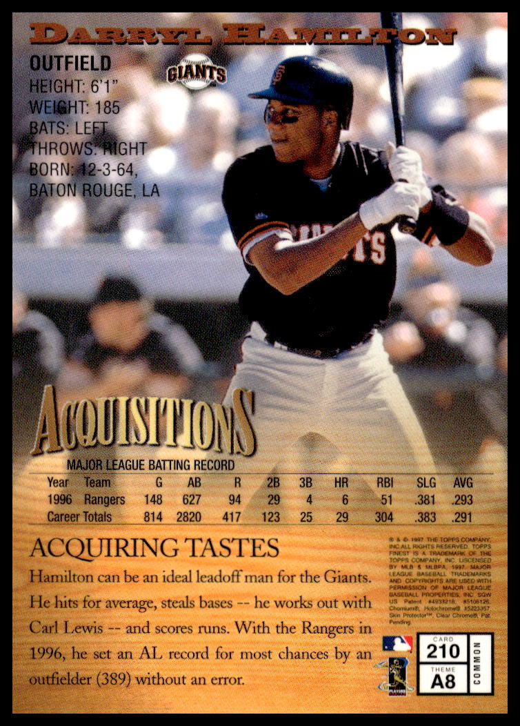 This Baseball card, from 1997 is part of the Topps Finest card set. Darryl Hamilton is featured and has a card number of 210.