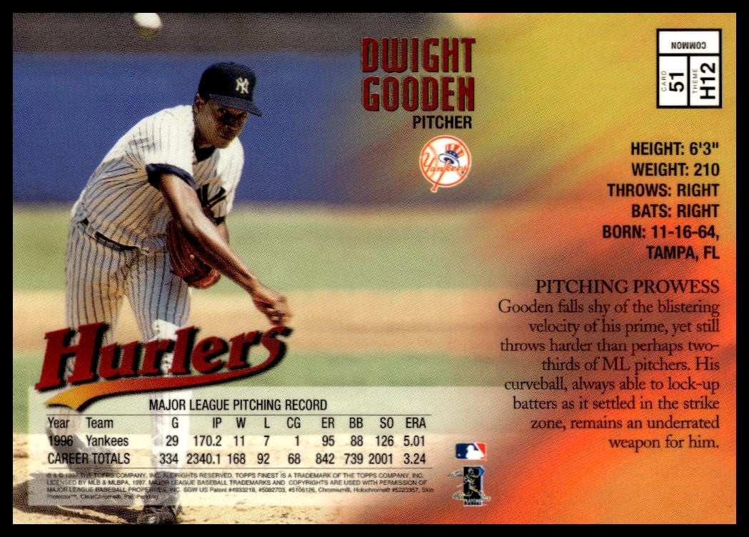 This BaseballΒ card, from 1997 is part of the Topps FinestΒ card set. Dwight Gooden is featured and has a card number of 51.