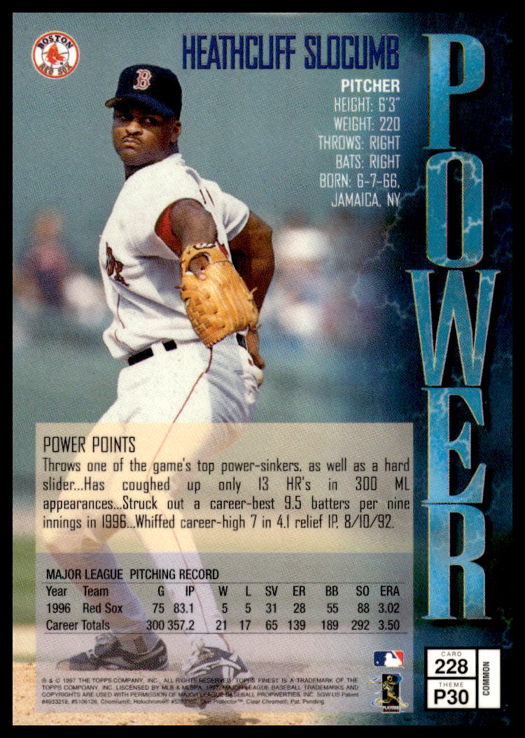 This BaseballΒ card, from 1997 is part of the Topps FinestΒ card set. Heathcliff Slocumb is featured and has a card number of 228.