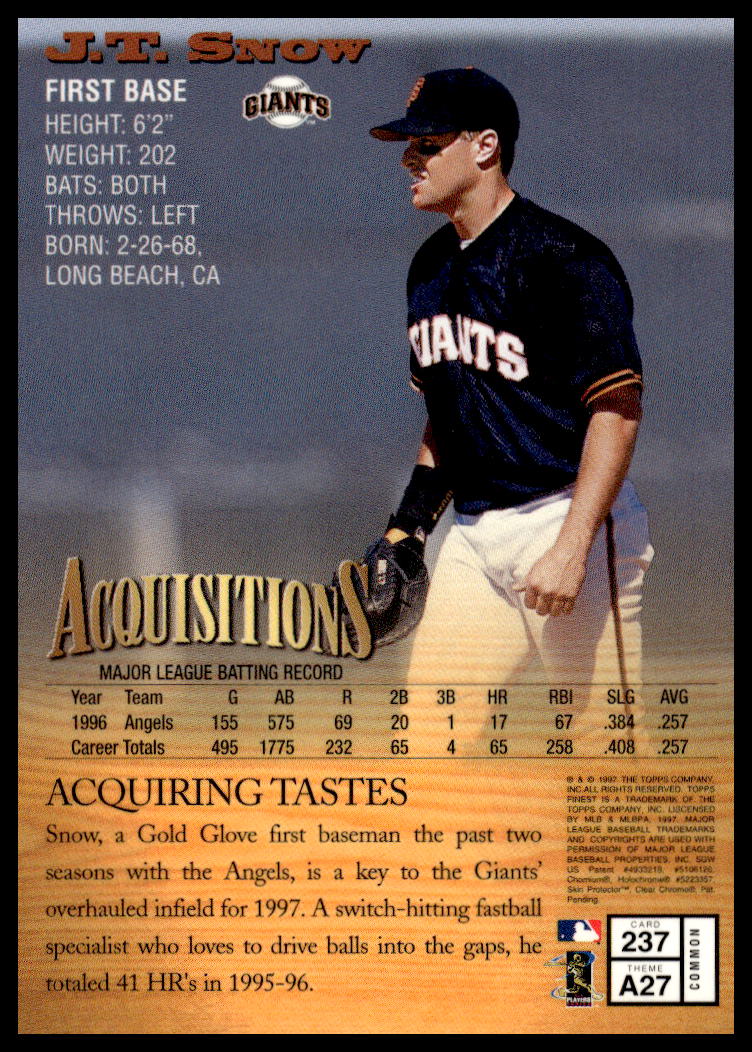 This Baseball card, from 1997 is part of the Topps Finest card set. J.T. Snow is featured and has a card number of 237.
