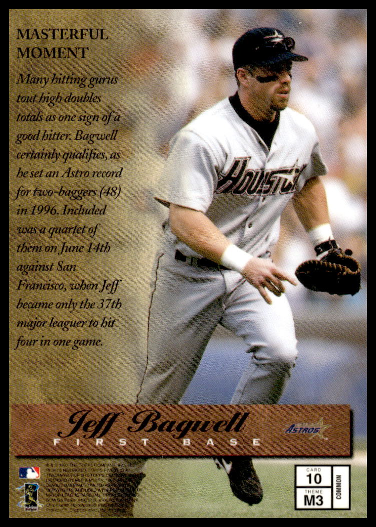 This BaseballΒ card, from 1997 is part of the Topps FinestΒ card set. Jeff Bagwell is featured and has a card number of 10.
