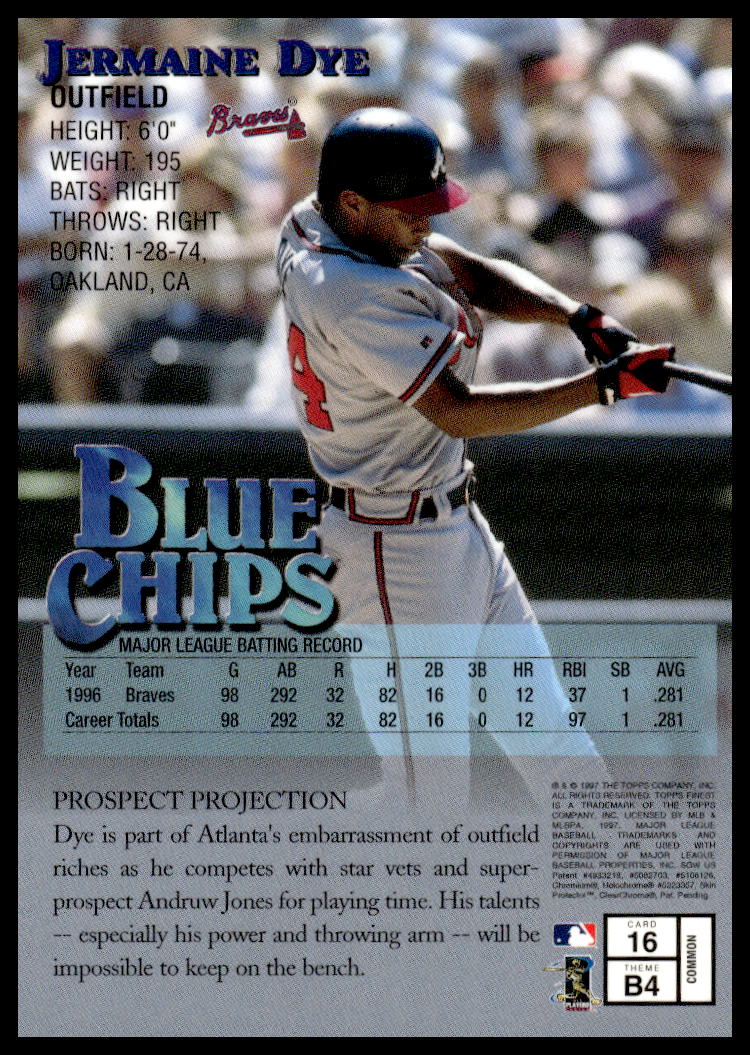 This BaseballΒ card, from 1997 is part of the Topps FinestΒ card set. Jermaine Dye is featured and has a card number of 16.