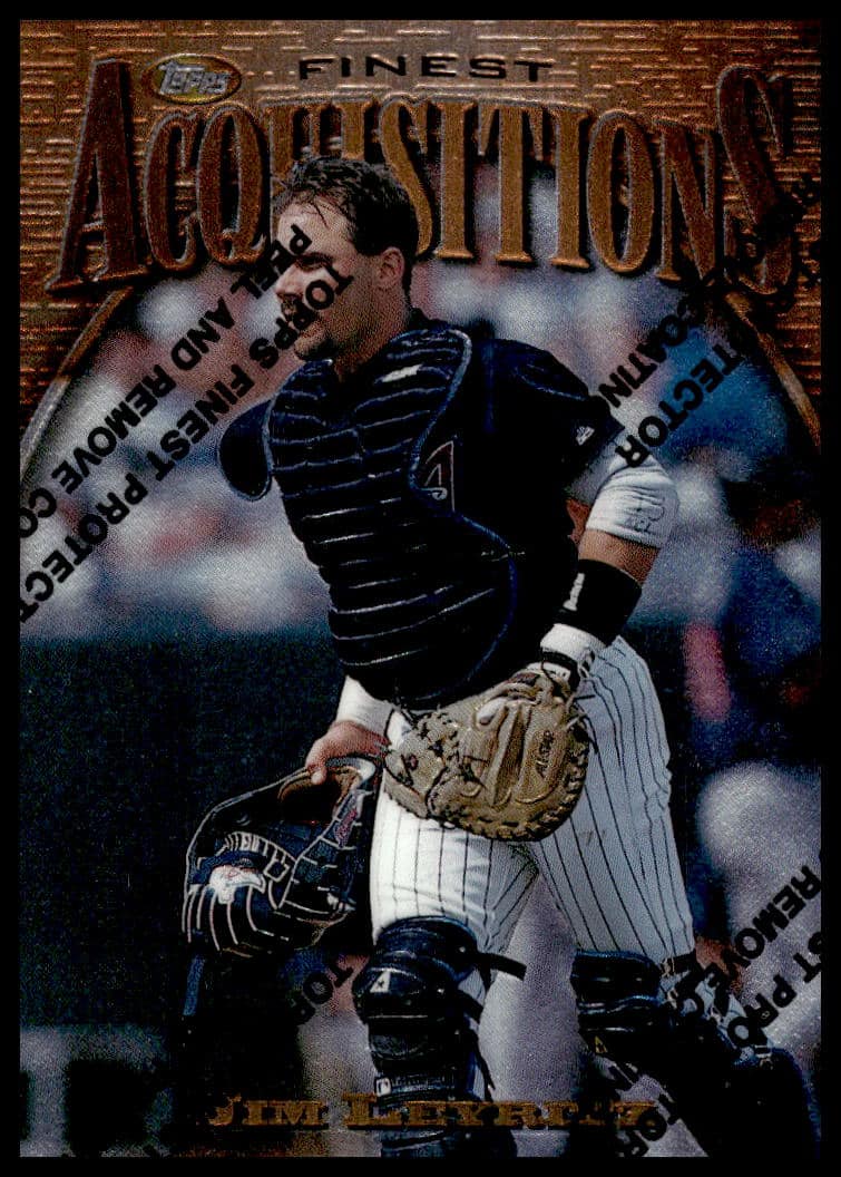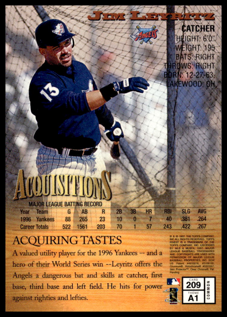 This Baseball card, from 1997 is part of the Topps Finest card set. Jim Leyritz is featured and has a card number of 209.