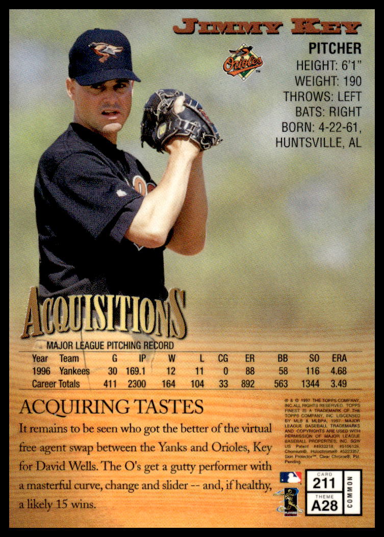 This Baseball card, from 1997 is part of the Topps Finest card set. Jimmy Key is featured and has a card number of 211.